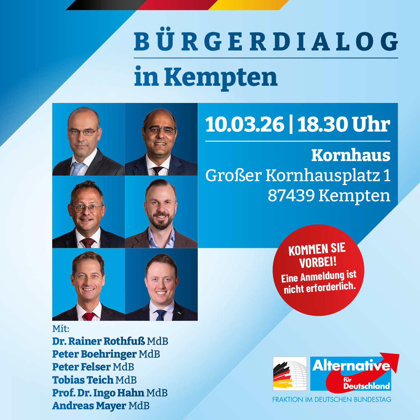Wir laden alle interessierten Bürger zum Bürgerdialog ein. Die ideale Möglichkeit für Sie, mit unseren Abgeordneten direkt in Kontakt zu treten und mehr über den parlamentarischen Arbeitsalltag zu erfahren. Nutzen Sie diese Gelegenheit, um Fragen zu stellen und mit uns über die Zukunft Deutschlands zu diskutieren. Wir freuen uns auf Ihr Erscheinen! nEine Anmeldung ist nicht erforderlich. nDieser Bürgerdialog wurde beworben. n1. Der Sponsor (Details):AfD–Bundestagsfraktion, Platz der Republik 1, 11011 Berlin, buerger@afdbundestag.de n2. Einrichtung, die die politische Anzeige finanziert:AfD–Bundestagsfraktion n3. Zeitraum der Veröffentlichung:ab 02.03.2026(Kombi Tageszeitung + Wochenblatt – Anzeige 1/4 Seite 139 x 280mm ) n4. Aggregierte Beträge für die politische Werbekampagne:4618,15 € inkl. Mwst. n5. Informationen über die Herkunft der Beträge:Öffentliche Mittel aus dem Bundeshaushalt, Mittel der AfD Bundestagsfraktion, Deutschland, innerhalb der EU. Keine privaten oder Drittlandsquellen. n6. Methode zur Berechnung der aggregierten Beträge:AZ-Marketing und Service GmbH n7. Offizielle Informationen über die Modalitäten der Teilnahmean den Wahlen im Zusammenhang mit der politischen Anzeige:Die Anzeige steht in keinem direkten Zusammenhang mit einer Wahl.